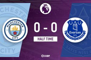 上半场伤停补时2分钟,半场结束,曼城暂0-0埃弗顿。