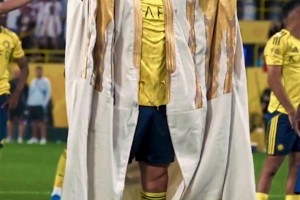 上一篇: 特殊装扮!沙特建国日,C罗带队取胜后身着沙特传统金色长袍谢场