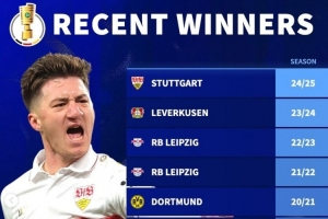 德转列近10年德国杯冠军:拜仁3冠但已5年未夺冠 莱比锡、多特2冠